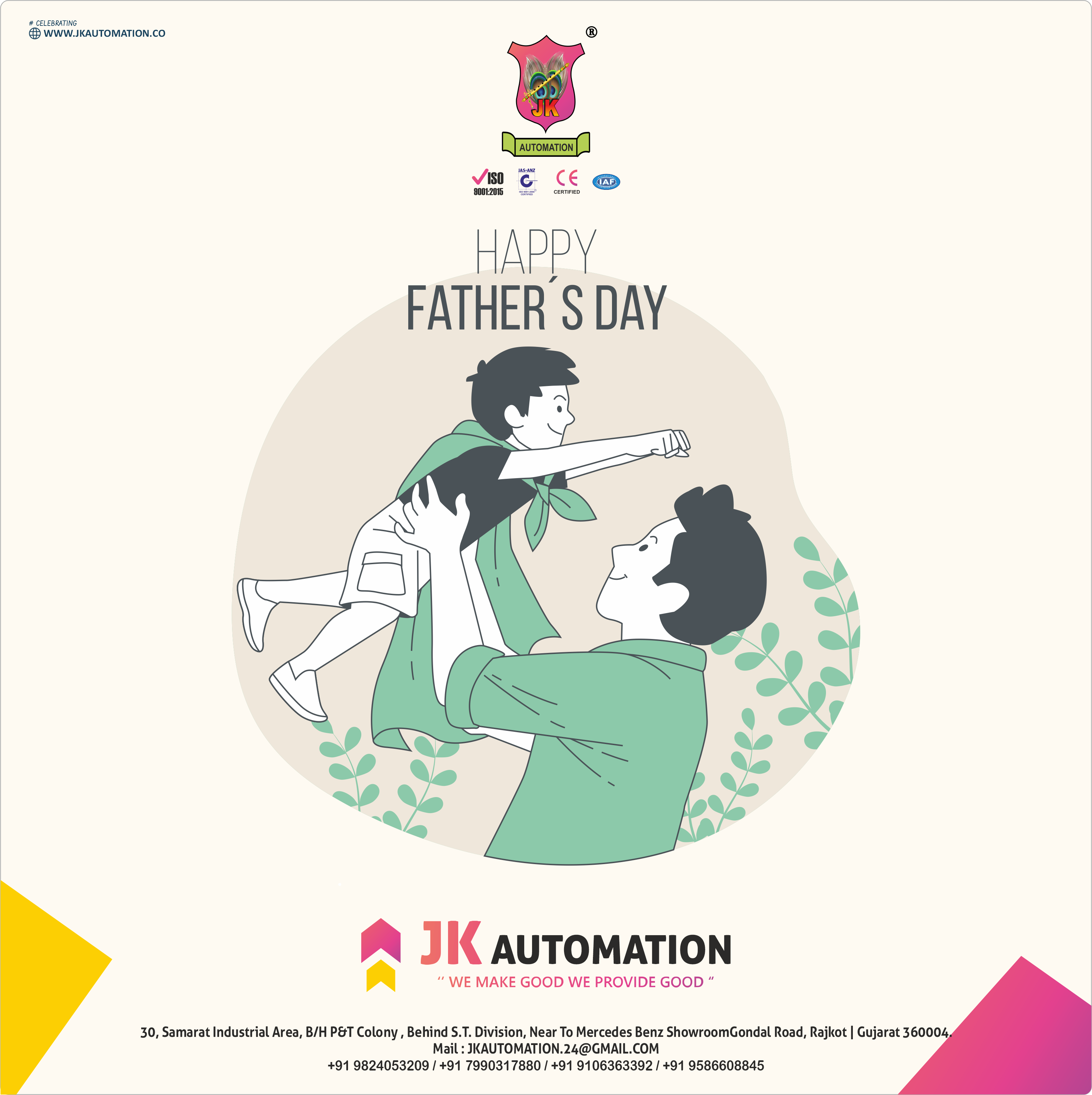 JK AUTOMATION extends warm wishes to all the amazing fathers out there on this special day. Happy Father's Day! Your dedication, love, and support are truly appreciated. May your day be filled with joy, laughter, and unforgettable moments with your loved ones. Cheers to the incredible fathers who make a difference in the lives of their children and families!" "A Father's Love: Happy Father's Day to an Amazing Dad! Once upon a time, in a small town nestled amidst rolling hills, there lived a father like no other. His name was James, and he had a heart as warm as a summer's breeze and a smile that could light up the darkest of days. James had two children, Emily and Ethan, who adored him beyond measure. He was their hero, their guiding light, and their partner in countless adventures. Every Father's Day, they would go above and beyond to make it truly special for him. On this particular Father's Day, Emily and Ethan woke up before the crack of dawn, their little eyes filled with excitement. They tiptoed into the kitchen, armed with an array of ingredients and a secret plan. Whisking, stirring, and giggling, they created a breakfast fit for a king. As the sun painted the sky with hues of gold, the delicious aroma of pancakes and freshly brewed coffee wafted through the house. Emily and Ethan tip-toed into their father's room, carrying a tray adorned with a colorful bouquet of wildflowers and a handwritten note that read, "To the Best Dad in the World." James, awoken by their sweet surprise, couldn't help but smile from ear to ear. He embraced his children tightly, their love filling the room with warmth. They spent the day together, embarking on their favorite activities playing catch in the park, building towering sandcastles on the beach, and sharing laughter over ice cream cones. As the day drew to a close, James held Emily and Ethan close, feeling blessed beyond words. They cuddled on the couch, sharing stories and dreams. In that moment, time seemed to stand still as the bonds of love between father and children grew stronger than ever. As the stars began to twinkle in the night sky, Emily and Ethan presented their father with a handmade photo album, capturing their cherished memories throughout the years. Tears welled up in James' eyes as he leafed through the pages, realizing how fortunate he was to be a father and witness his children's joy. In that moment, surrounded by love and gratitude, James knew that Father's Day was not just about a single day of celebration. It was a reminder of the profound joy, responsibility, and privilege of being a fathers role he embraced with unwavering devotion. So, as Father's Day came to a close, the house was filled with whispers of "I love you" and contented sighs. Emily and Ethan drifted off to sleep, their hearts brimming with love for the extraordinary man they called "Dad." And in the quiet stillness of the night, James smiled, knowing that being a father was the greatest gift he could ever receive.