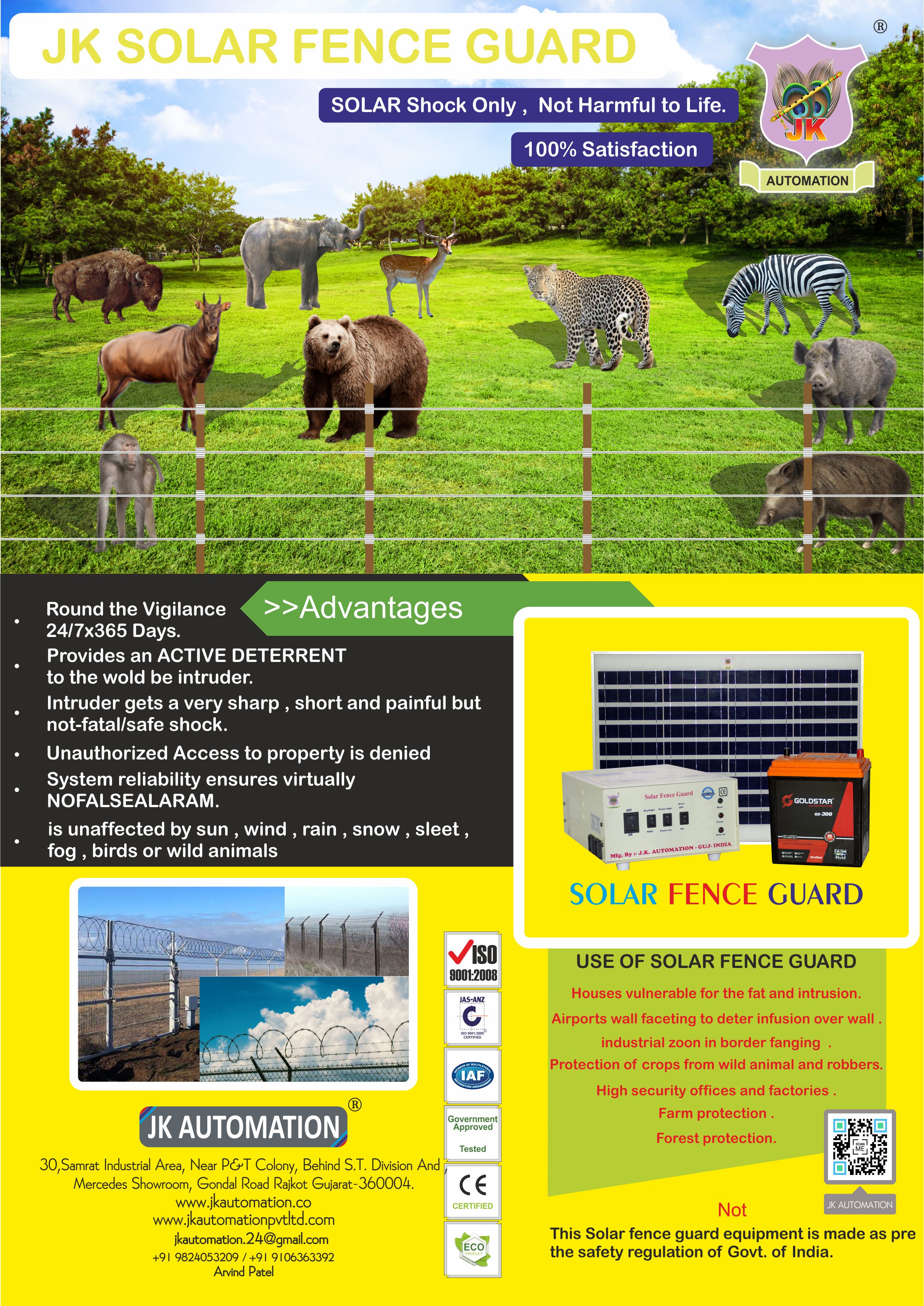 JK Automation is ISO 9001:2008 Certified Company We are Leading Manufacturers of Solar France Guard, ELCB+MCB, Auto Starter, Auto Timer Switch, Electronics Power sever Rectifier, Security System in Rajkot - Gujarat - India. Call at 9824053209 Zatka Machine Manufacturing in Rajkot Gujarat India. Solar Fence Manufacturing in Rajkot Gujarat India. Jatka Machine Manufacturing in Rajkot Gujarat India. Phase Changer Manufacturing in Rajkot Gujarat India. 3 Phase Changer Manufacturing in Rajkot Gujarat India. Power Saver Elcb+mcb Manufacturing in Rajkot Gujarat India. Electronics Relay Manufacturing in Rajkot Gujarat India. 1 Co Electronics Relay Manufacturing in Rajkot Gujarat India. Elcb+mab Manufacturing in Rajkot Gujarat India. All Type Automation Product Manufacturing in Rajkot Gujarat India. We Are Selling in All Over India. Vadodara Gujarat India. Surat Gujarat India. Bhuj Gujarat India. Junagadh Gujarat India. Jamnagar Gujarat India. Yamunanagar Haryana India. Panipat Haryana India. Kurukshetra Haryana India. Uttarakhand India. Himachal Pradesh India. Jammu and Kashmir India. Delhi India. Uttar Pradesh India. Chhattisgarh India. Odisha India. Punjab India. Andhra Pradesh India. Arunachal Pradesh India. Meghalaya India. Manipur India. Mizoram India. Haryana India. Rajasthan India. Madhya Pradesh India. Tamil Nadu India. Kerala India. Bihar India. Jammu and Kashmir India. Goa India. Puducherry India. Telangana India. Odisha India.