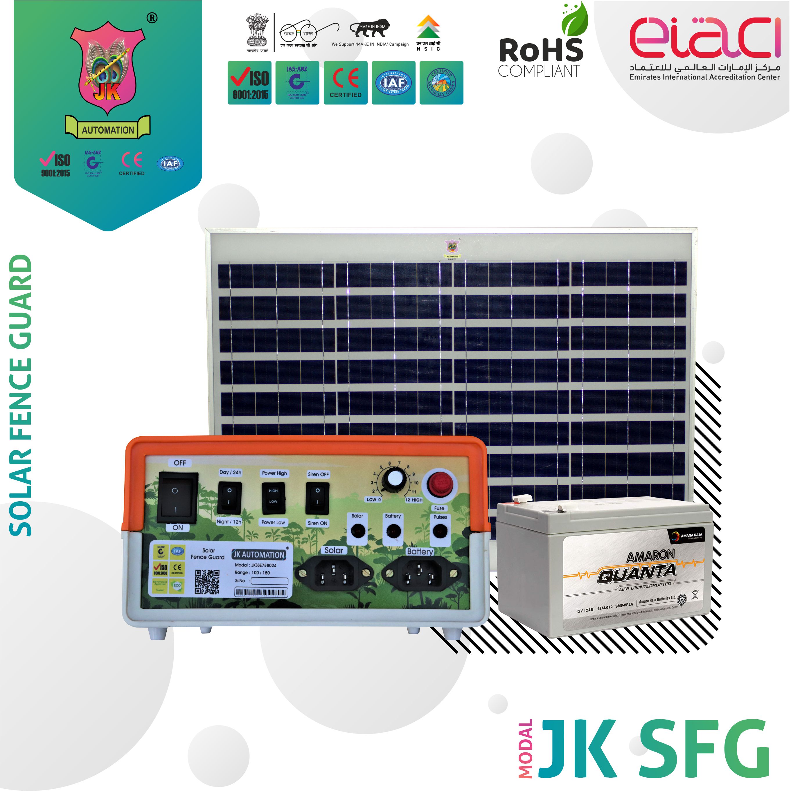 SOLAR FENCE GUARD/ SOALR JATKA MACHINE JK SFG * 100VIGHA Description MODAL: JK SFG RANGE: 100 BIGHA Output energy: 25 TO 100 BIGHA Set Output Voltage: 6 to 9 KVA Output current: 5.6A Pulse Interval: 1.2 second nominal Pulse Duration: 200 micro second, nominal HV output: 8000 V 1 zone LV output: 9000 V 1 Zones Input current: 1.5A, to 500ma nominal Battery: 12V/12AH AMRON Input solar: 20WATT JK MAKE SIREN: NO DAY / NIGHT: YES HIGH-LOW POWER: YES OUTPUT AUTO CUT: YES PRICE: 10, 499.00 *INCLUDING GST *
